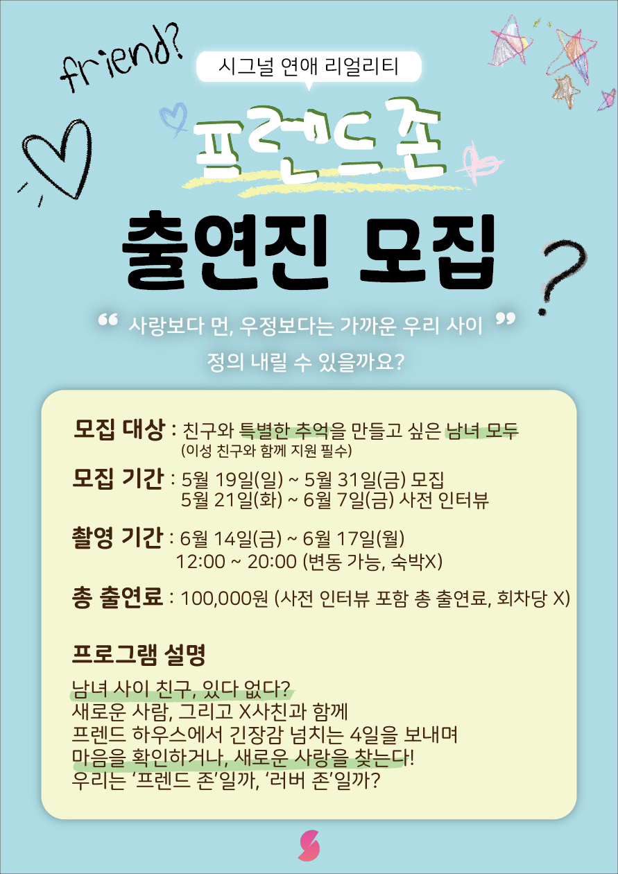 🤩 <프렌드존>과 함께할 남녀 찐친들을 찾습니다 🤩 시그널에서 이번 여름, 👫 리얼리티 연애 예능 프로그램 <프렌드존>과 함께할 출연자를 모집합니다! 🩵 우정일까, 사랑일까? 사랑보다 먼, 우정보다는 가까운 우리 사이 정의 내릴 수 있을까요? 어른이라기엔 어딘가 서툰 청춘들의 연애, 그리고 정의 내리기 어려운 이성 친구와의 사이! 애매한 관계를 정의 내려줄 연애 프로그램 <프렌드존>! 새로운 사람, 그리고 X사친과 함께 프렌드 하우스에서 누가 서로의 프렌드일지, 관심있는 사람이 ‘프렌드 존'일지, ‘러버 존'일지 긴장감 넘치는 4일을 보내며 사랑을 확인하거나, 새로운 사랑을 찾습니다 ! <프렌드존>에서는 새로운 이성과 X사친, 남녀 총 6명이 모여 긴장감 넘치는 며칠을 보내며 마음을 확인하거나, 새로운 사랑을 찾게 됩니다! 누가 서로의 프렌드일지, 관심있는 사람이 ‘프렌드 존'일지, ‘러버 존'일지 확인하고 사랑을 찾으세요😎 환승연애, 하트 시그널 등! 두근두근한 연애프로그램의 주인공이 될 기회는 바로 지금, 진정한 LOVER를 찾아가는 여정, 그 단면을 시그널과 함께 기록해보아요! 당신을 기다립니다!😎 출연진 모집인원 : 남성 3명, 여성 3명 출연료 : 100,000원 (프로그램 총 출연료로, 사전 인터뷰 포함 모든 촬영 회차의 총 출연료입니다) 출연진 모집기간 : 2024.05.19~2024.05.31 출연진 사전미팅 기간 : 2024.05.21.~2024.06.07 출연진 지원 폼 : https://forms.gle/kdDx1A3CuKNYyJRX6 *본 설문은 출연진 모집만을 위해 사용되며, 모집기간이 끝나면 안전하게 폐기됩니다. 사전 미팅은 기간내 서울지역권 내에서, 대면으로 진행됩니다. ⭐️촬영일 : 06/14(금) ~ 06/17(월) 12:00 ~ 20:00 (변동 가능성 O)⭐️ 시그널 유튜브 https://www.youtube.com/@shortfilmsignal 시그널 인스타그램 @shortfilm_signal https://www.instagram.com/shortfilm_signal/ *유의사항 촬영은 서울 내에서 이루어지므로 이동 시간과 거리 고려 후 지원 부탁드립니다. 본 프로그램의 공개일정은 8월 말 정도로, 한 편 당 30분씩 총 4편으로 나누어 시그널 유튜브 채널에 업로드 됩니다.