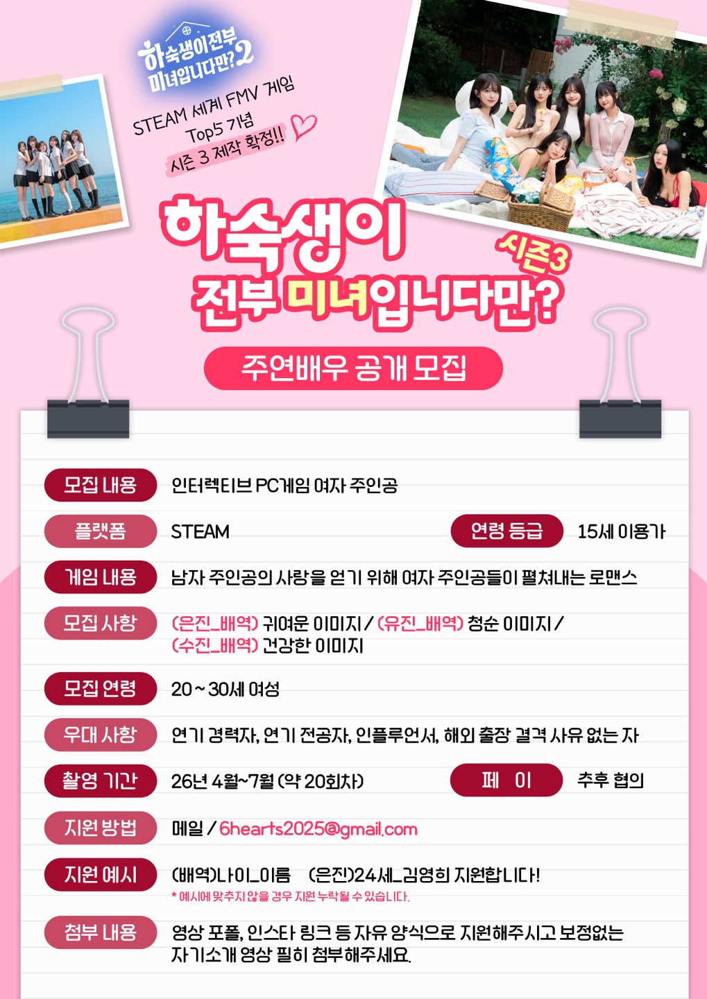 하숙생이 전부 미녀입니다만? 시즌3 주연배우 공개 모집 “하숙생이 전부 미녀입니다만? 시즌2 STEAM 세계 FMV게임 top5 기념 시즌3 제작 확정” 모집내용 : 인어렉티브 PC게임 여자 주인공 플랫폼 : STEAM 제작 업체 : 3Y코프레이션 , STORYTACO 연령 등급 : 15세이용가 게임 내용 : 남자 주인공의 사랑을 얻기 위해 여자 주인공들이 펼치는 로맨스 모집 사항 : (은진_배역) 귀여운 이미지 / (유진_배역)청순 이미지 / (수진_배역) 건강한 이미지 모집 연령 : 20~30세 여성 우대 사항 : 연기 경력자, 연기 전공자, 인플루언서, 해외출장 결격 사유 없는 자 촬영 기간 : 26년 4월~7월 예정 (최대 20회차) 페이 : 추후 협의 지원 방법 : 메일 6hearts2025@gmail.com 지원 예시 (배역)나이_이름 (은진)24세_김영희 지원합니다 *예시에 맞추지 않을 경우 지원 누락될 수 있습니다 첨부 내용 : 영상포폴, 인스타 링크 등 자유 양식으로 지원해 주시고 보정 없는 자기소개 영상 필히 첨부해주세요 많은 지원 부탁 드립니다 감사합니다.