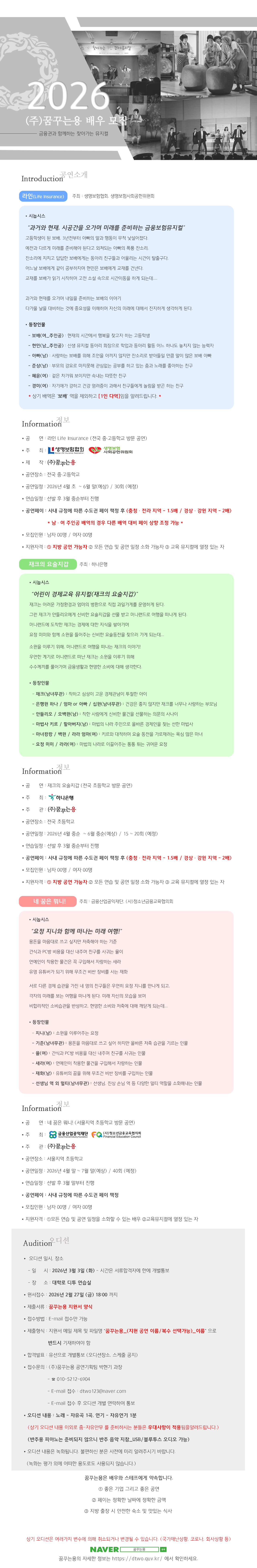 (주)꿈꾸는용에서 생명보험협회와 함께하는 금융보험뮤지컬 <라인(Life Insurance)> 하나은행과 함께하는 경제교육 뮤지컬 <재크의 요술지갑> 금융산업공익재단, (사)청소년금융교육협의회와 함께하는 경제,금융뮤지컬 <네 꿈은 뭐니!> 이상 3작품의 뮤지컬에 26년 상반기를 함께할 열정 넘치는 배우 분들을 모집하고 있습니다. 본 오디션은 전 배역을 모집하고 있으며 서류 심사 후 대면 오디션으로 진행됨을 알려드립니다. 지원하시는 배우분들은 각 1분 이내의 연기/노래를 준비해주시면 됩니다. * 개인적으로 자유 안무를 준비해오실 경우 우대사항이 적용됨을 알려드립니다. * 페이는 사내 규정에 따른 수도권 페이 책정 후 지방 공연 시 추가된 금액으로 지급해드립니다. 자세한 사항은 하단 이미지를 통해 확인하실 수 있습니다. 많은 지원 부탁드립니다!